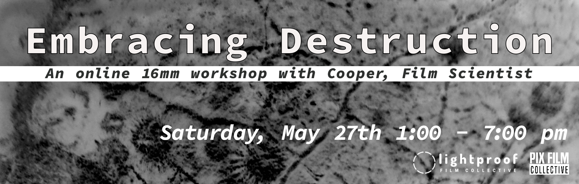 Filmmakers are trained to take care of their film negatives and to protect the negative from dust, scratches, chemical stains and more. In this workshop Cooper wants you to destroy your film’s emulsion and the images you have so carefully composed for you to discover art within a destructive process.